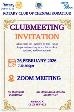 The Club Board Meeting of the Rotary Club of Chennai Korattur was h. . .